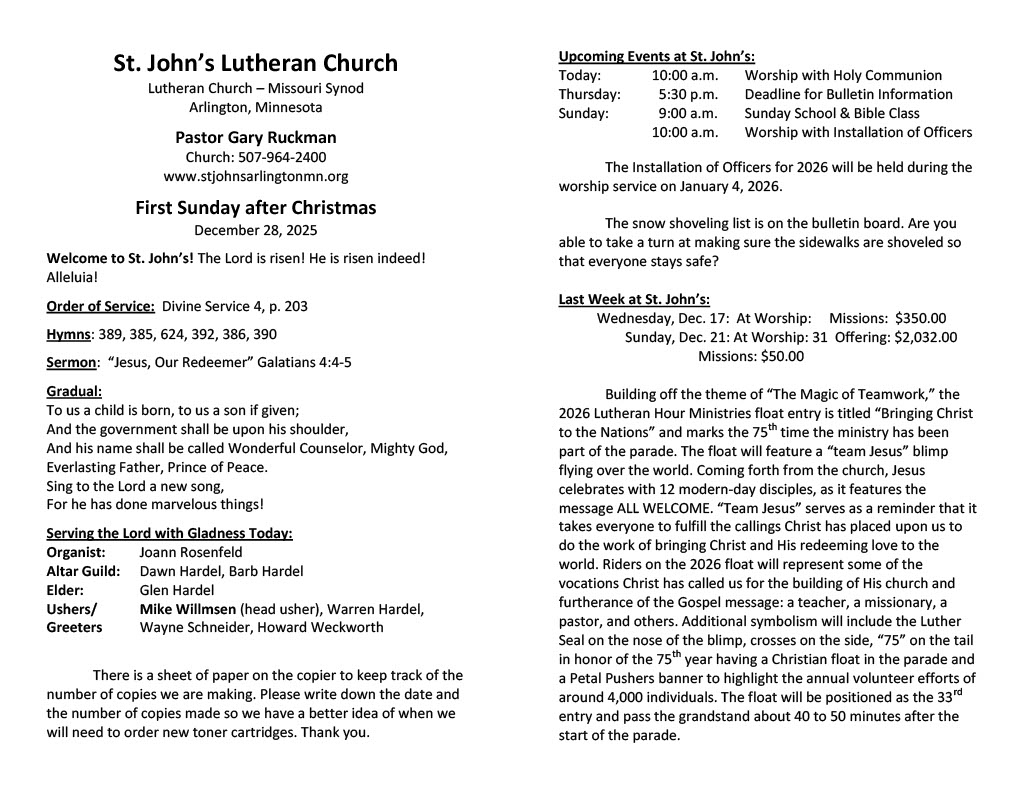 Ushers/Greeters: Mike Willmsen (head usher), Warren Hardel, Wayne Schneider, Howard Weckworth